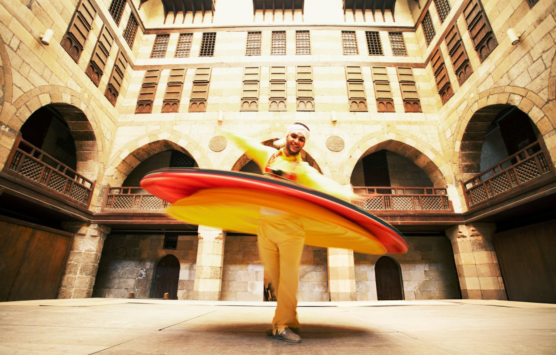 Watch colorful-robed dancers spin in mesmerizing circles while traditional Arabic music fills the ancient stone halls.